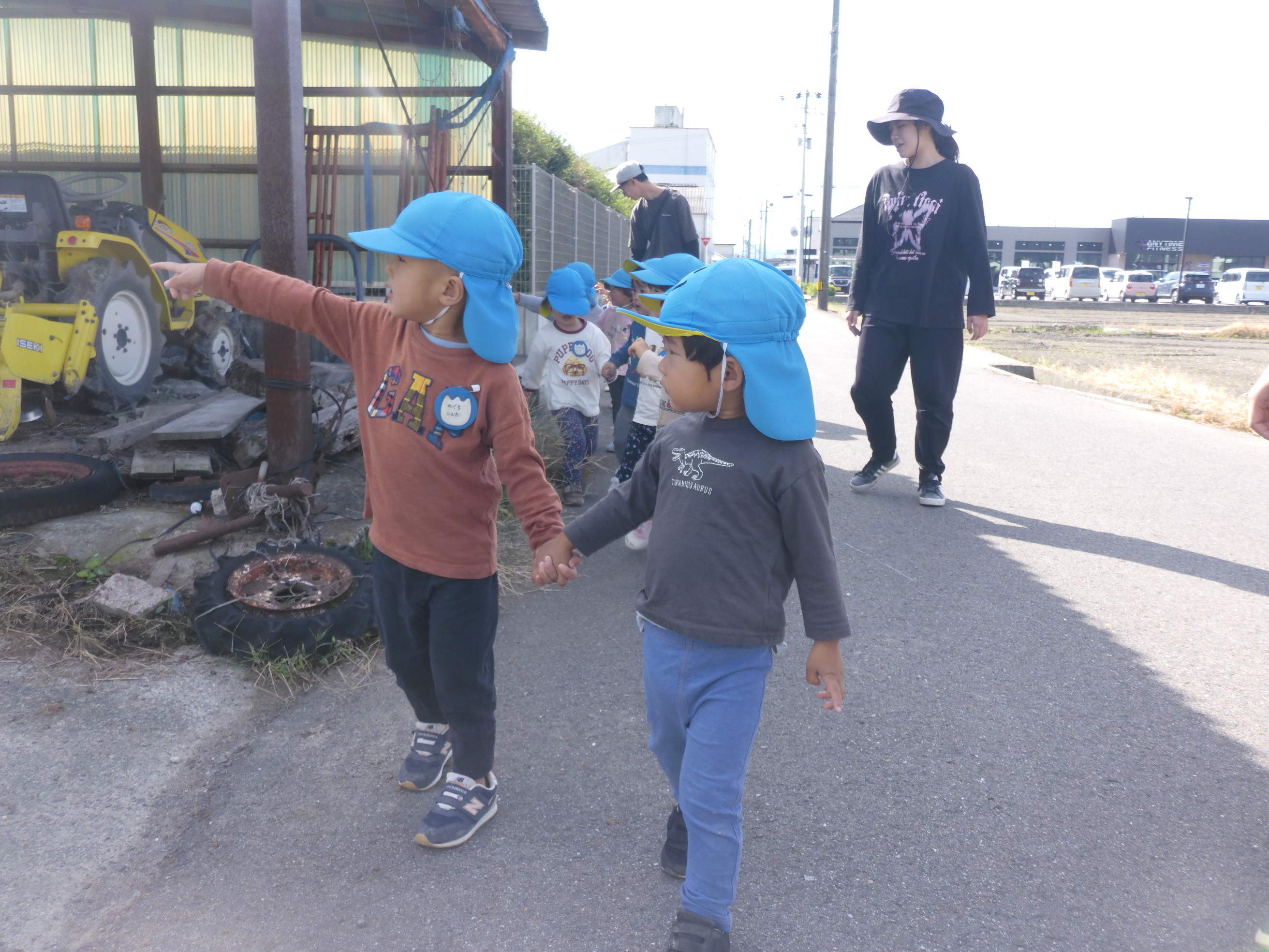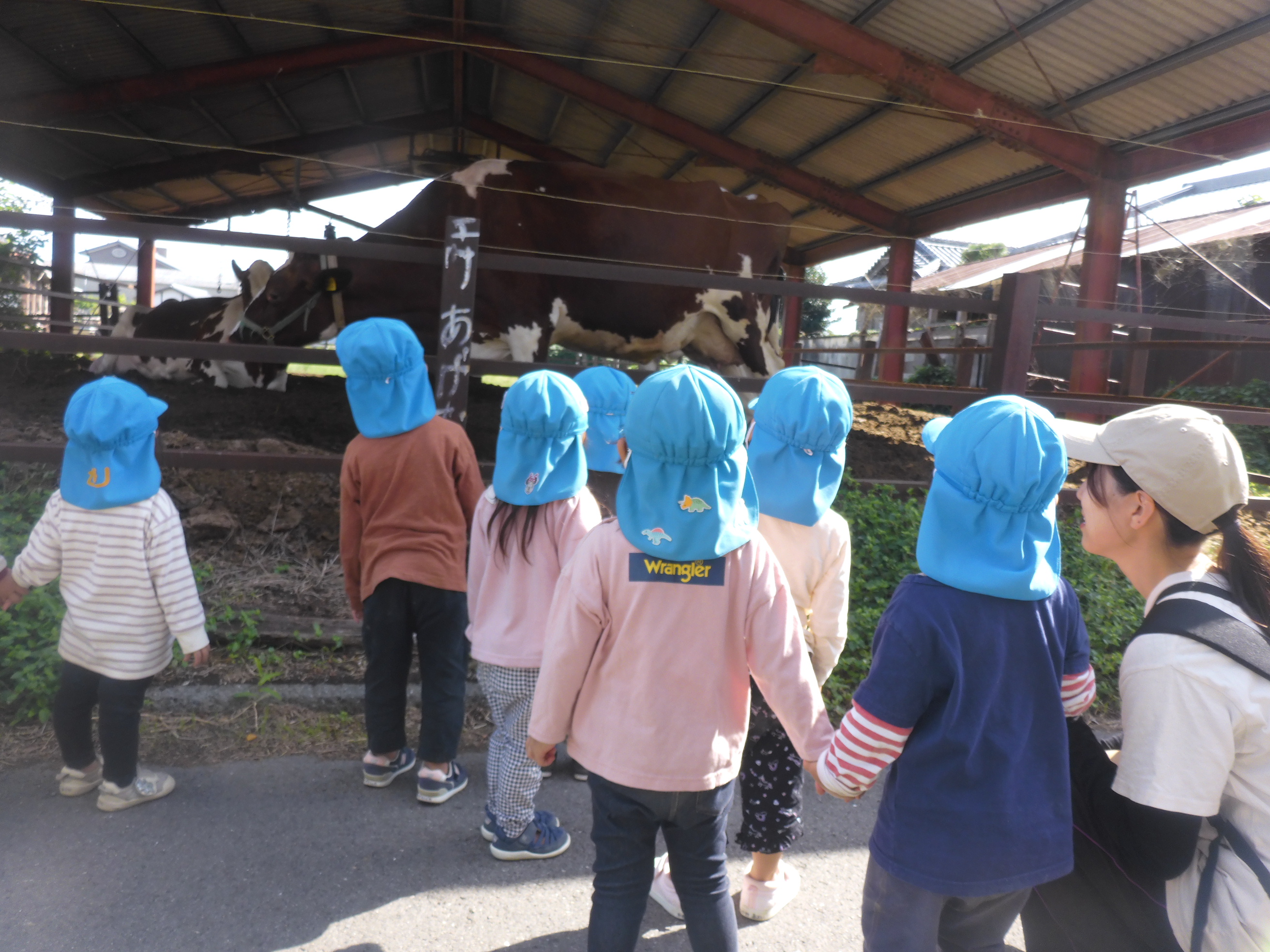 牛舎の前を通ると、牛が近くへやってきました。手を振ったり、びっくりして後ずさりしたり‥子どもたちの様々な表情が見られました。
