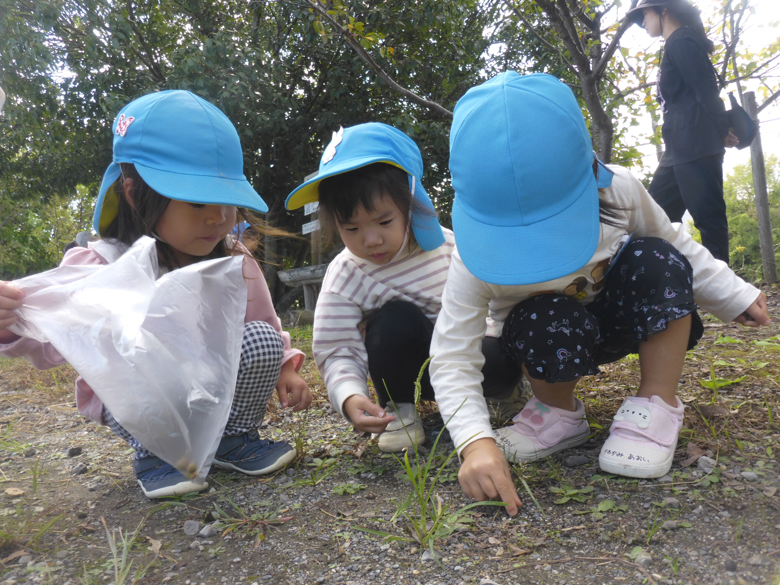 川の近くに着くと、木の実や落ち葉がたくさん!「何か匂いする」と匂いを嗅いでみたり、「このドングリは緑やな」と見比べたりと、色々な発見がありました。見つけた木の実は大事そうに袋に入れていた子どもたちです。