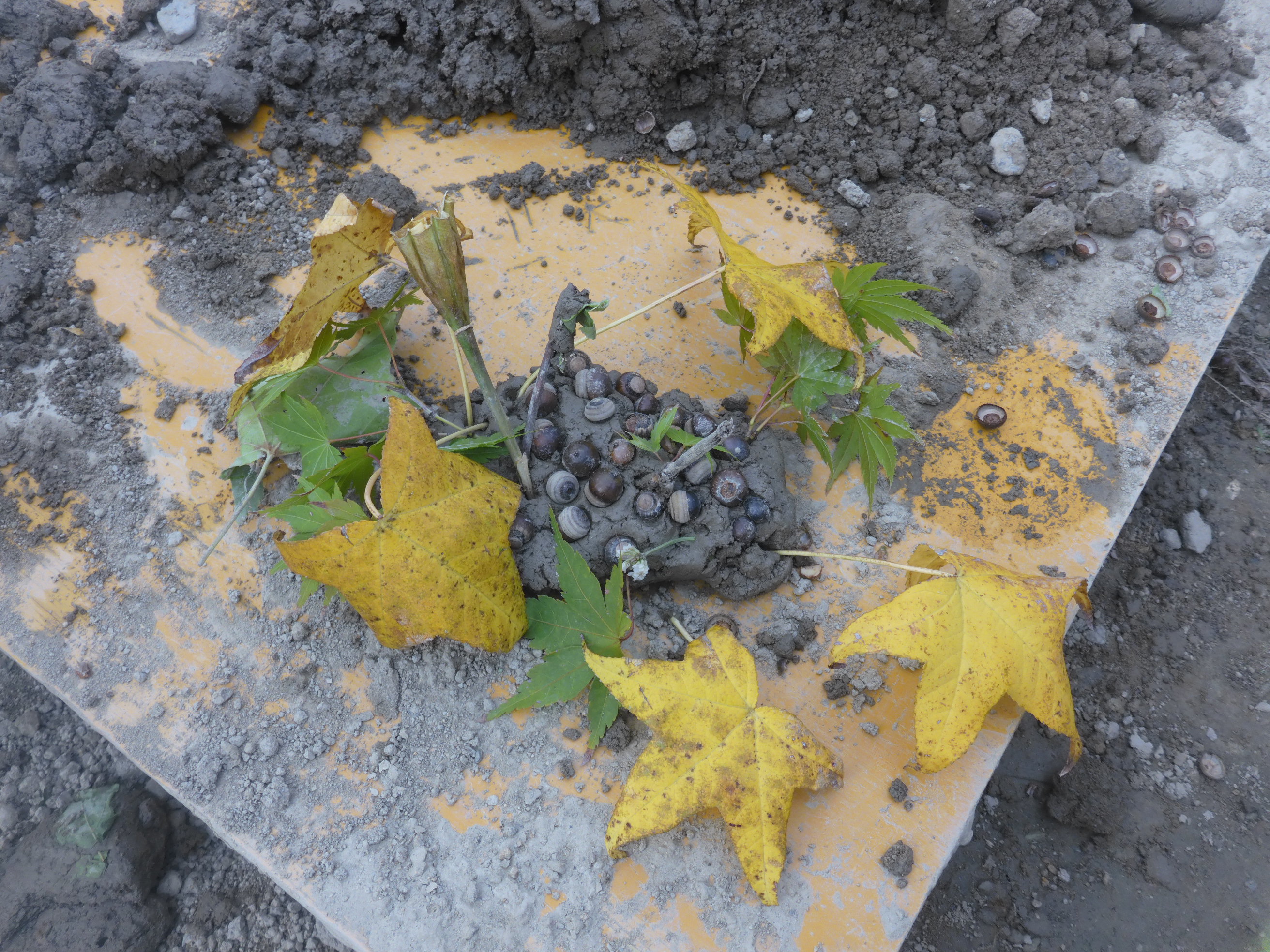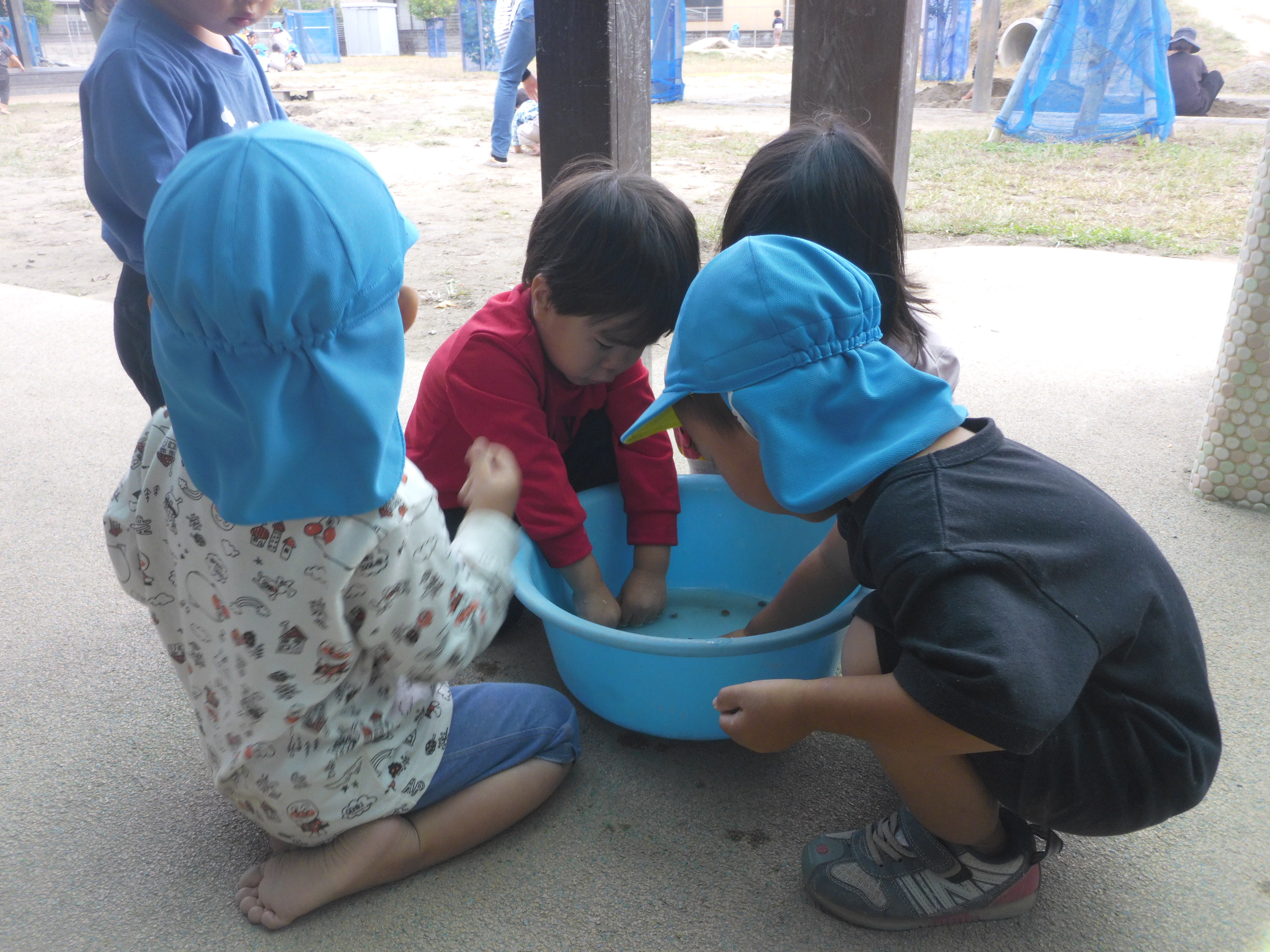 保育園に帰り、さっそく拾った木の実を使って造形遊びが始まりました。「水に入れたらどうなるん?」とタライに水を入れて試してみたり、戸板では、トッピングを乗せて秋のケーキが完成しました!