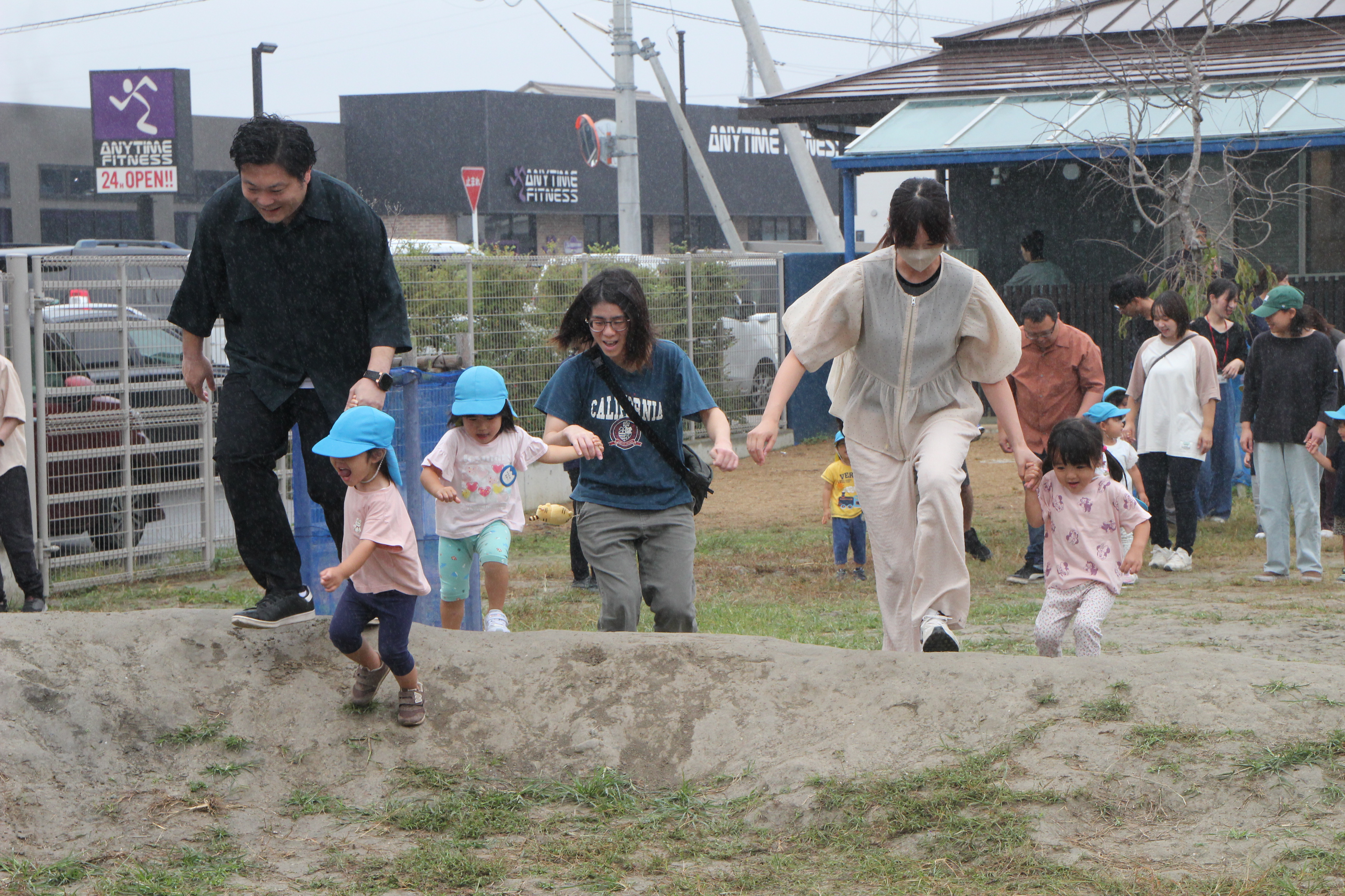 園庭で毎日遊んでいる子どもたちは、土山のでこぼこも走って、乗り越えます。