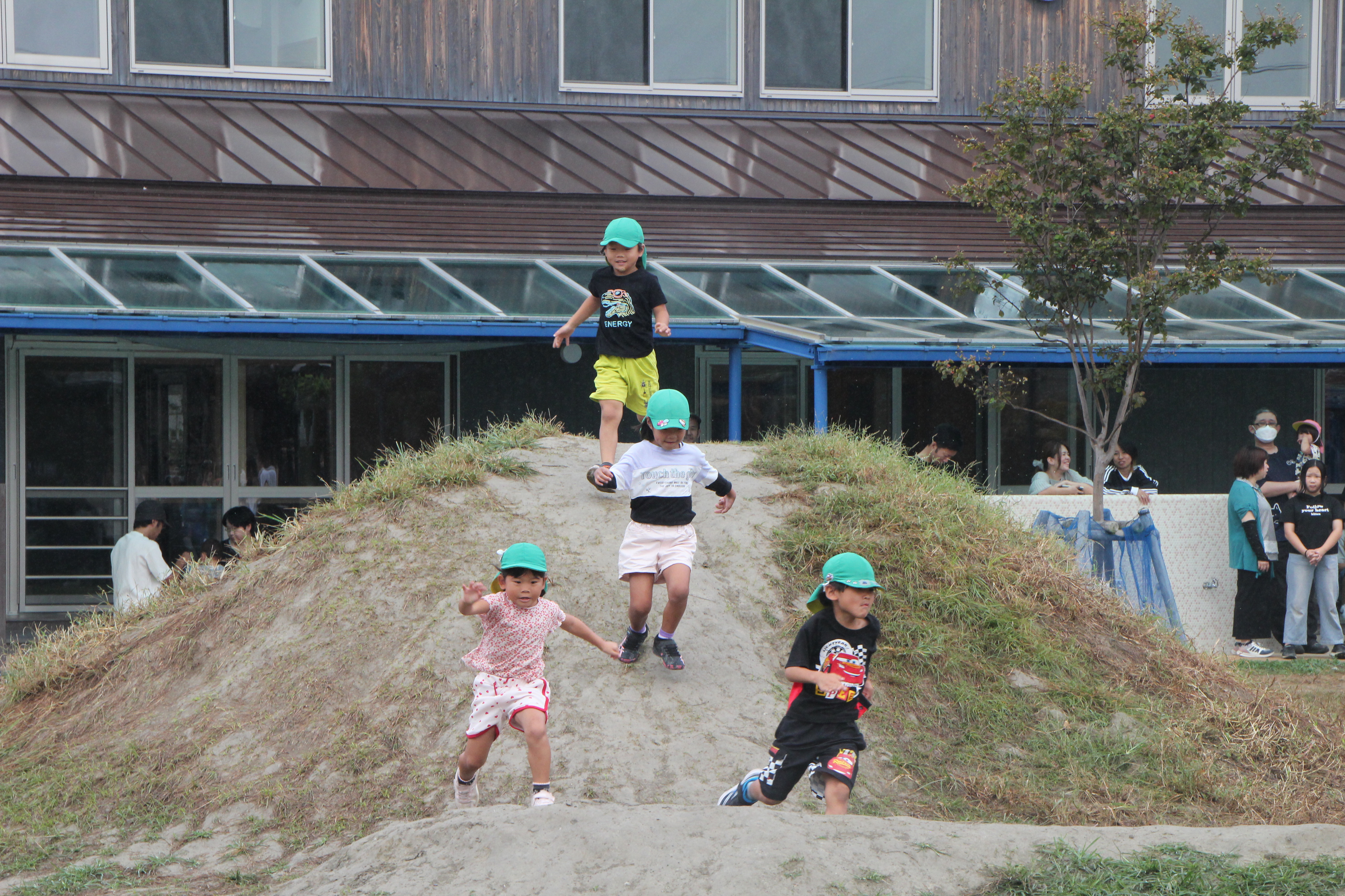 かけっこでは、築山を越えて、土手を走り、園庭一周を精一杯頑張りました。