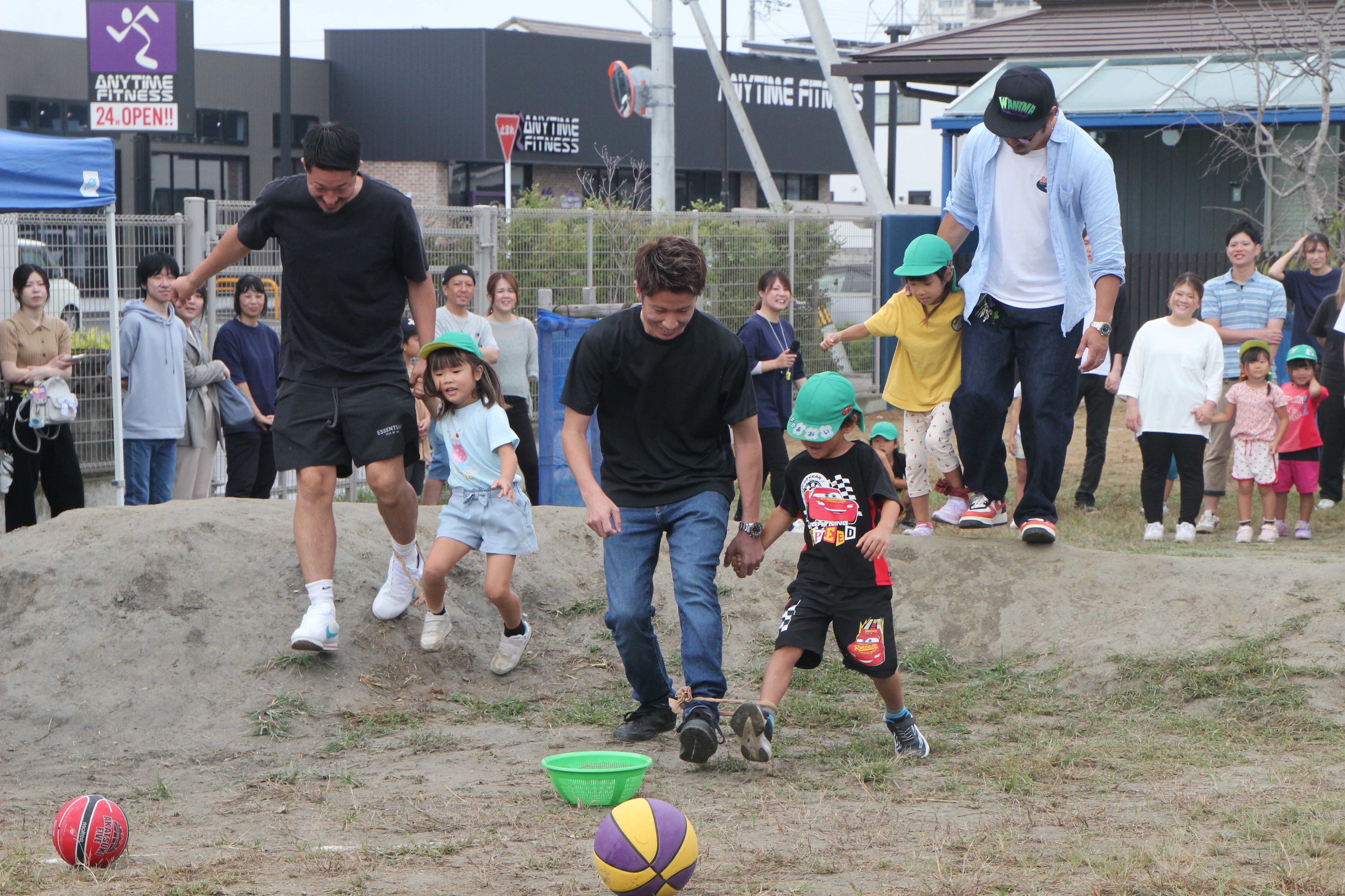 お家の方と2人3脚で走って、お腹とお腹でボール運び。そしておんぶでゴール!