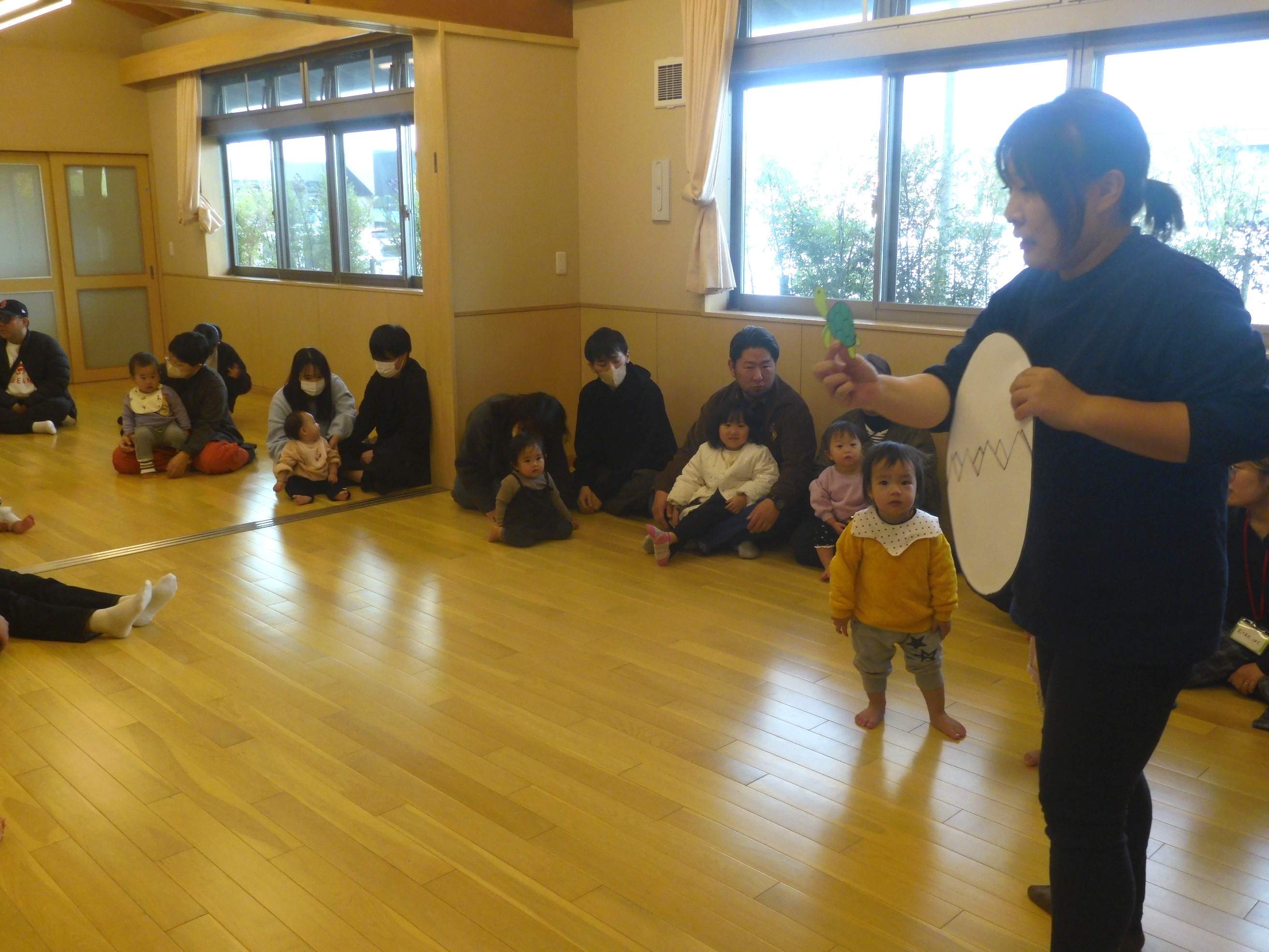 最後に“たまごたまご”のペープサート。アリさん、カメさん、ヒヨコさん‥次から次へとたまごから赤ちゃんが生まれます。子どもたちもおうちの方の膝の上で見たり近づいたりと、興味津々で見入っていました。