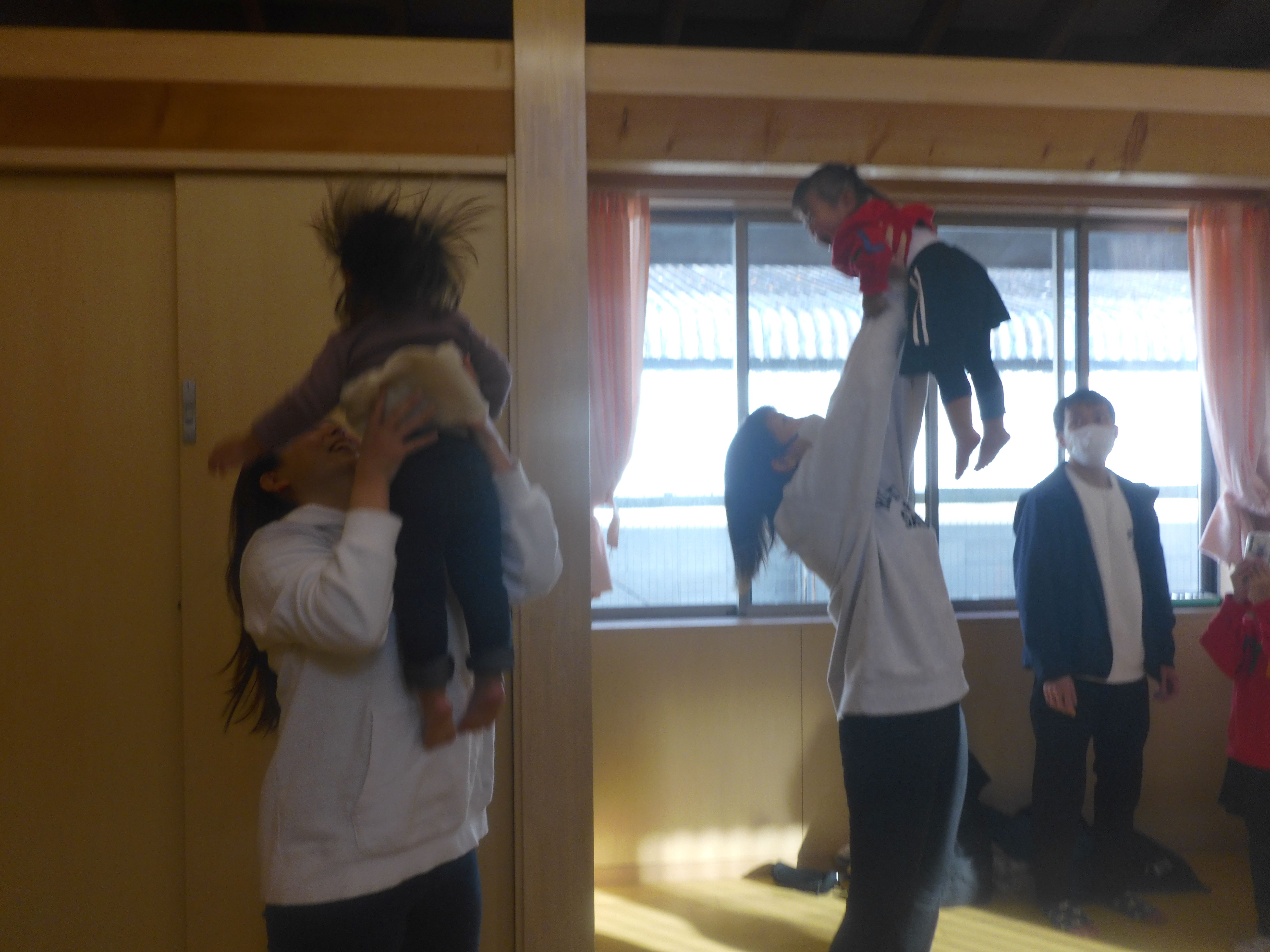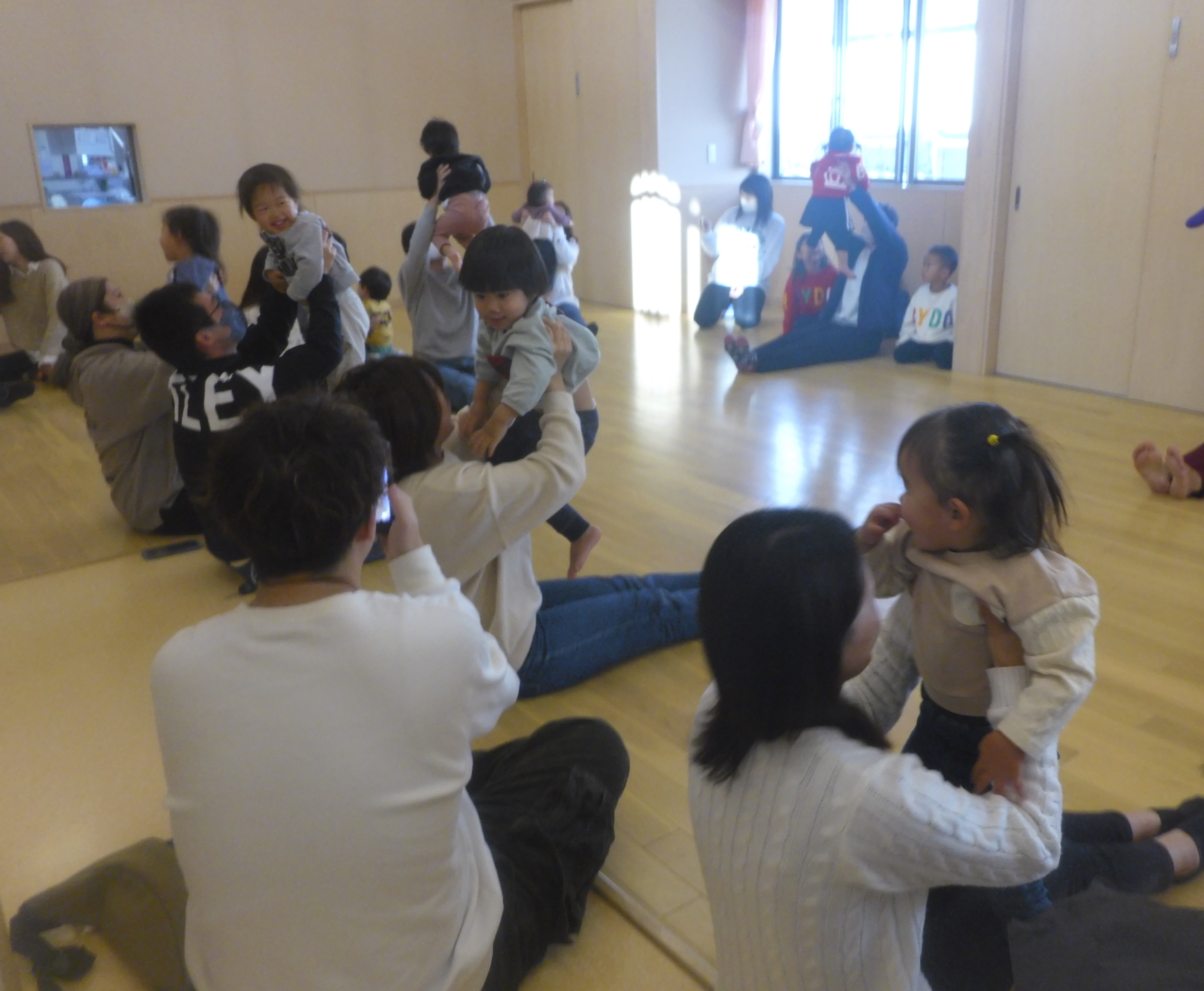 音楽に合わせて、「ロケット」や「飛行機」「車」を表現します。おんぶされたり、横や縦の動きで、子どもたちの嬉しそうな表情が見られました。