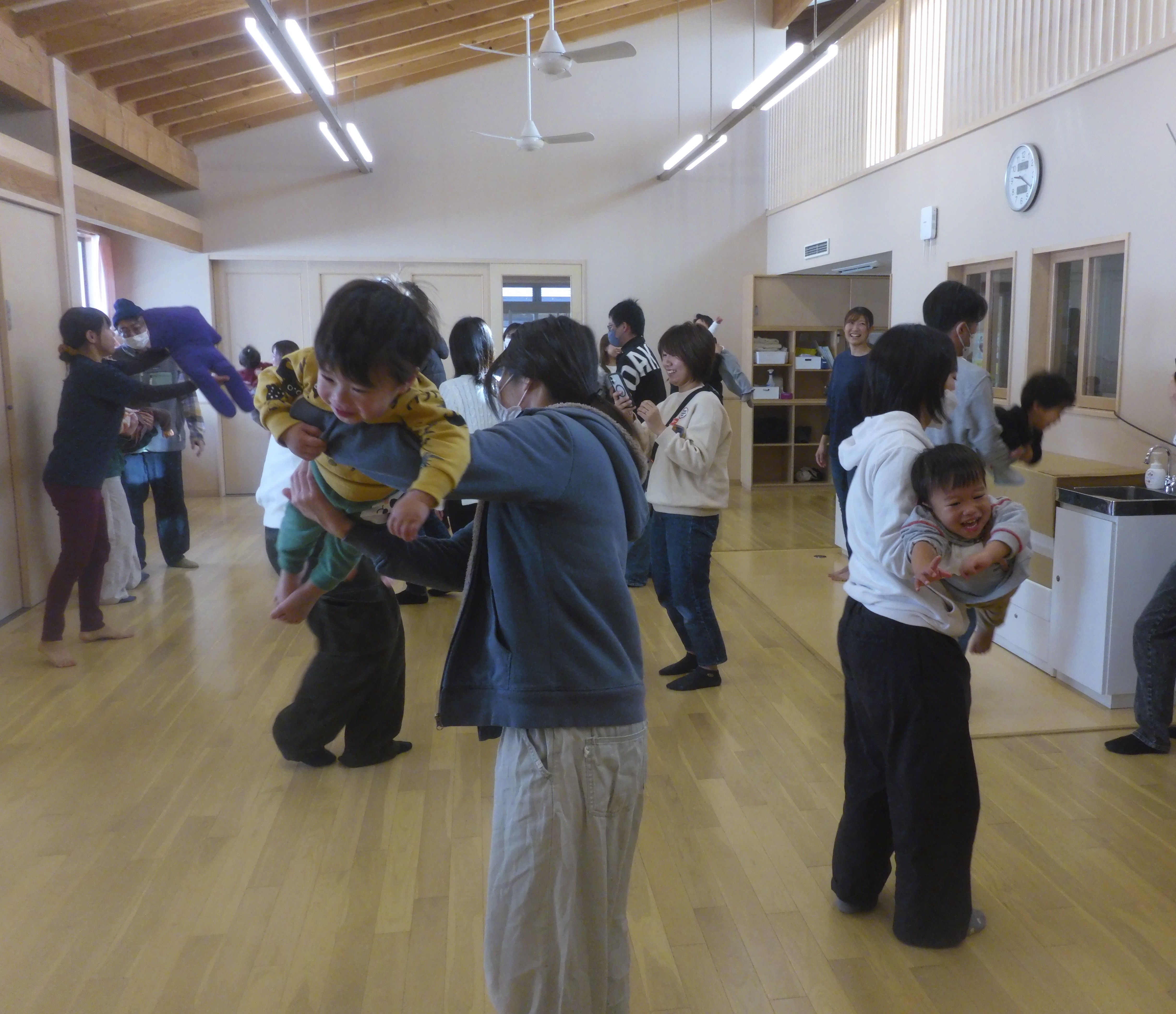 そのほかにも、♪だるまさんがころんだ♪で、一緒に転がり親子で体幹を鍛えました。